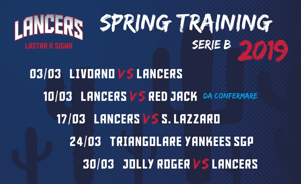 Si inizia Domenica 3 con un doppio incontro da 7 riprese con il Livorno Baseball (serie B) sul campo labronico; stessa modalità, incontro da confermare, Domenica 10 Marzo sul Lancers Field con i Red Jack di Grosseto (serie B).